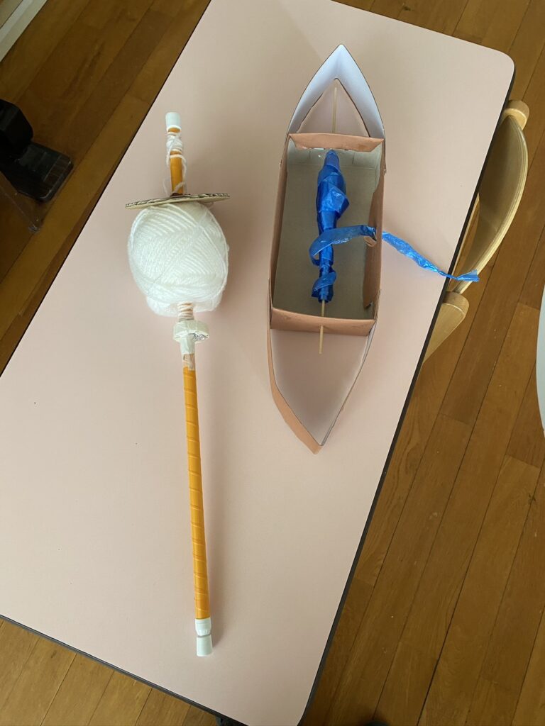 ペレのあたらしいふく アトリエ通信 2025.12.24 スウェーデンの絵本作家エルサ·ベスコフの 「ペレのあたらしいふく」をご存知ですか? 羊の毛を刈り、糸を紡ぎ、布に織り上げ、服を作るという物語なのですが 幼稚園の先生をしてらっしゃるKさんが この物作りのお話をお遊戯会の題材に選び 実演されたお話をしてくださいました 手作りの小道具がとても可愛かったので、画像を送っていただきました。 シャトルと紡錘 カラフルなメイポール