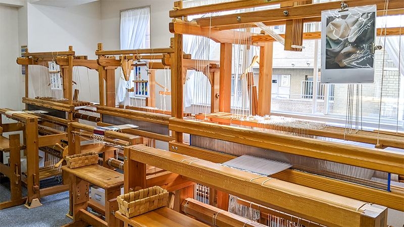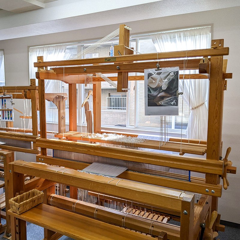 スウェーデン製の大型織機を使用します。共用の経糸はあらかじめセットされていますので、初心者の方でもご心配はいりません。