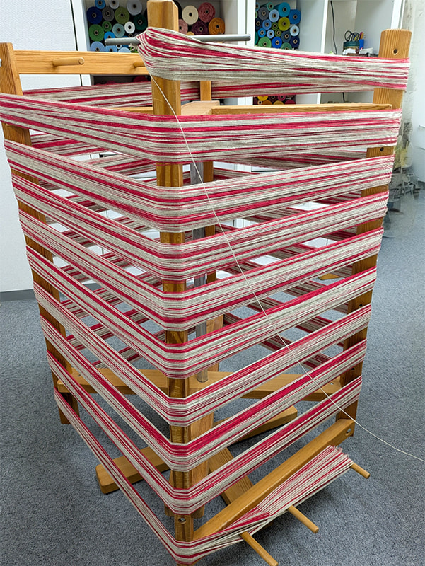 織りたい布の幅と長さに合わせて、必要な長さ・本数の経糸(たていと)を用意します。