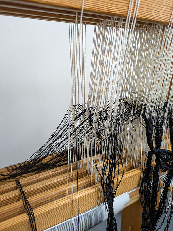 白い糸綜絖に黒い経糸を通したところです。なかなか根気のいる作業です。 - 筬(おさ)通し
